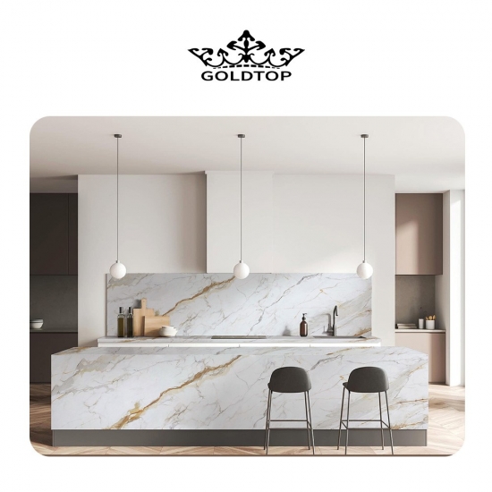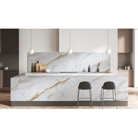 Ощутите неподвластную времени роскошь с нашими Фарфоровая плита Calacatta Gold 7001 Эта изысканная плита мастерски передает сущность натурального мрамора Калакатта, отличаясь сияющим белым фоном, элегантно испещренным прожилками золота и едва заметных серых оттенков. Ее большой формат и исключительная прочность создают цельный, роскошный акцент для столешниц, стен и полов, превращая любое пространство в шедевр утонченной элегантности.