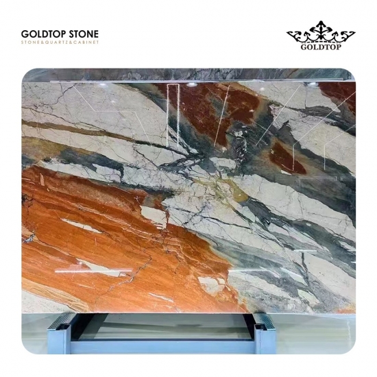 Бразилия Breche Fantastic Marble : Роскошный образ. Сияющая оранжево-красная основа оживляется яркими, широкими прожилками бежевого, кремового, жёлтого и чернильно-серого. Эксклюзив. Смелый. Не существует двух одинаковых плит. Это мастерское сочетание огненно-оранжевого, тёплого кремового и классического серого создаёт поистине притягивающий взгляд и неподвластный времени образ. .