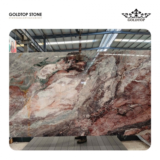 Камбоджа, цветущая сакура, розовый мрамор Известный своей исключительной цветовой композицией, камень «Цветущая вишня» сочетает розовые, красные и синие оттенки в изящном, живописном выражении природного искусства. Толщина: 2 см (3/4 дюйма), шлифованная/полированная плита.